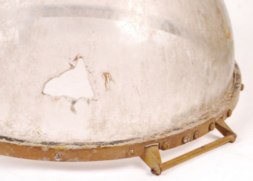 An incredibly rare WWII Second World War believed Vickers Warwick heavy RAF bomber astrodrome. Perspex construction, with opening vent to top and steel riveted frame to base. The front marked ' Front '. Some damage, possibly that of an enemy gun. Measures approx; 70cm diameter (including handles)