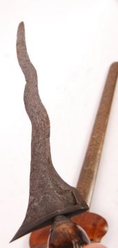An original 19th / 20th century antique Malayan Kris dagger of usual form having a carved (ukiran) wooden hilt, brass decorative collar (Mendak), usual wave blade (wilah) having three waves along with a scabbard having a shaped wooden top (Gambar) with a decorated brass cover (Pendok). Measures; 50cm overall.
