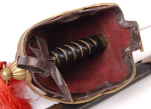 A vintage late 20th century theatrical Wilkinson's sword style 1828 pattern British Highland Infantry Officers sword having a large pierced basket hilt with tassel pommel, leather and wire bound grip along with an ebonised scabbard having brass furnishings revealing a plain steel blade. Measures; 111cm.