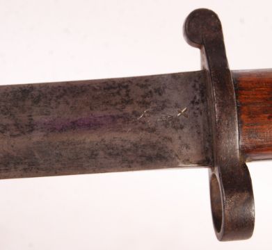 A WWI First World War British military cavalry 1888 pattern Lee Metford / Lee Enfield rifle comprising of a wooden and brass riveted grip, steel pommel, cross guard with muzzle hole and quillon, fullered blade with markings to both side of the ricasso along with a leather and brass furnished scabbard and frog. Measures; 47cm.