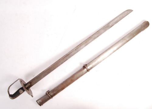 A rare antique 1796 Pattern British Heavy Cavalry Trooper's sword. Shallow fullered blade, with inspector’s stamp in fuller at forte, pierced disc guard, and plain rounded pommel. Leather grips. Maker's marks to edge for Sohlingen. Within it's original steel scabbard.  Measures approx; 106cm long.
