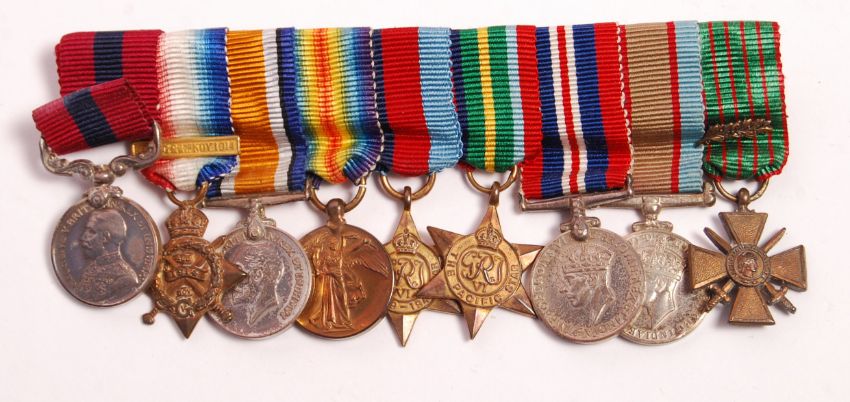 An exceptional WWI First World War and WWII Second World War related medal group, belonging to a MS- 861 Private H. Craib of the Army Service Corps and later V145969 (WWII). The medal group comprising: Distinguished Conduct Medal (engraved MS861 WOCL1 H. Craib), WWI Mons Star (with 1914 clasp), WWI War Medal, WWI Victory Medal (with Oak Leaf for a mention in despatches), WWII 1939-45 Star, WWII Pacific Star, WWII Australia Service Medal, WWII War Medal, and his WWI Croix de Guerre with palm (for acts of Heroism in the field). The group  is accompanied by it's full set of miniatures, a bar (for the First World War group, with oak leaf) and other related effects to the soldier. Mentioned in despatches, London Gazette issue No. 29072, page 1669. A fascinating and rare medal group.