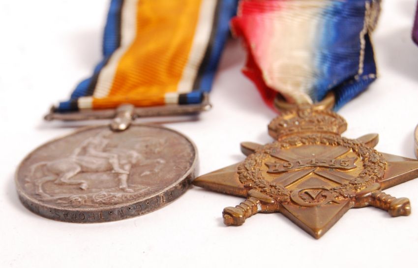 A WWI First World War medal group / trio awarded to a 1411 Private G. W. Thomas of the North Somerset Yeomanry. Comprising; War Medal, Victory Medal and 1914-15 Star. All with original ribbons. Consigned from family.