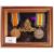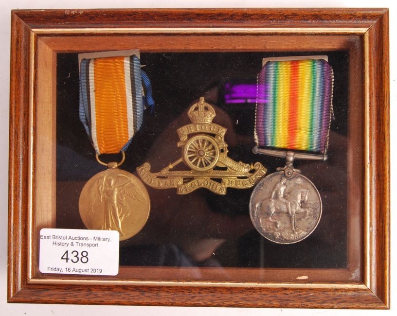 A WWI First World War medal pair awarded to a 109779 Gunner J. W. Cochrane of the Royal Artillery. Comprising Victory Medal and War Medal and a Royal Artillery cap badge. Mounted, with display frame.