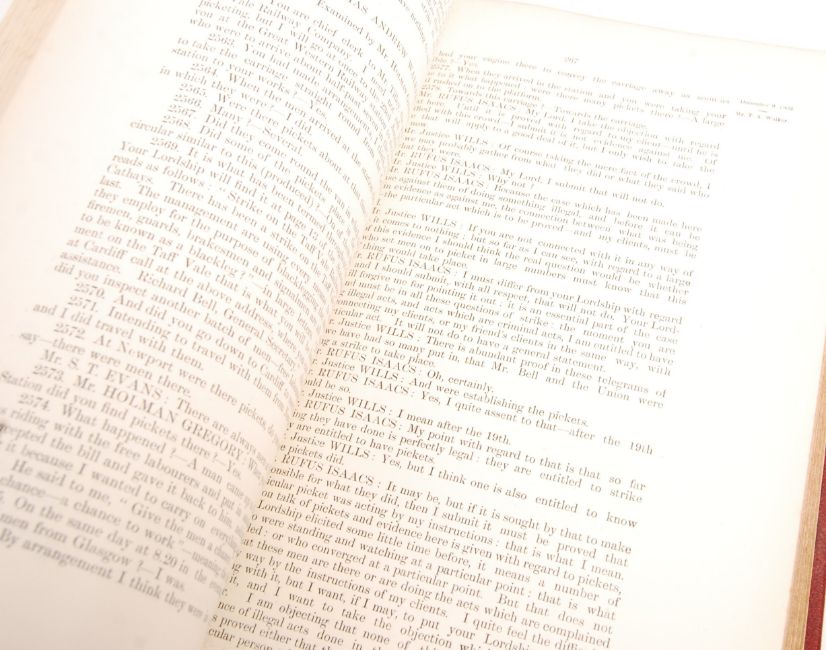 A rare The Taff Vale Railway V The Amalgamated Society Of Railway Servants and others Notes of Proceedings and Verdict Before Mr Justice Wills and a Special Jury in the High Court of Justice King's Bench Division Ingledew & Sons Cardiff Solicitors for the Plaintiffs 1902. Red boards with red marble inside pages having beautiful gilded lettering to spine and front cover.