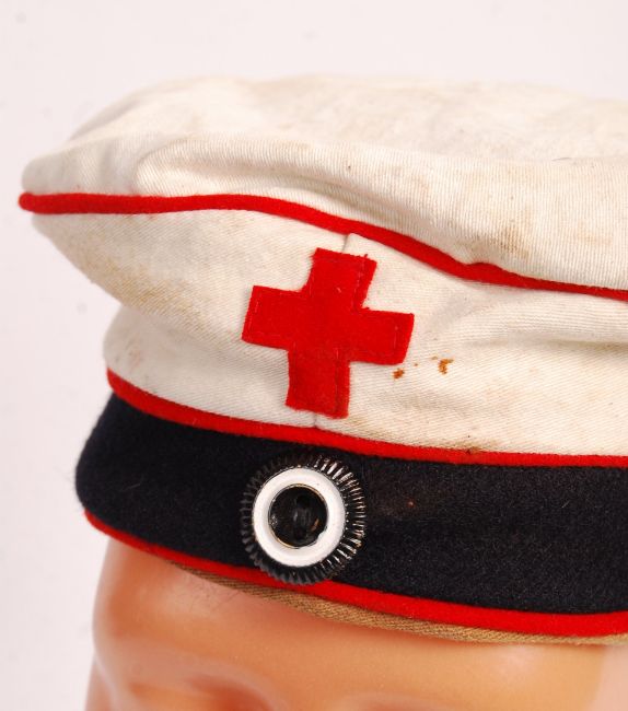 A rare WWI First World War Imperial German Medic's Feldmutze field uniform cap. White, with red piping and red cross to front. Initials inside ' MW '. Rare German cap.