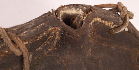 A rare 17th/18th century English Civil War period leather Blackjack type Costrell water carrier flask of typical form. The barrel shaped body having stitched leather sides with joined pouring hole section with holes for handle. Believed original flax handle present. Measures 28cm.