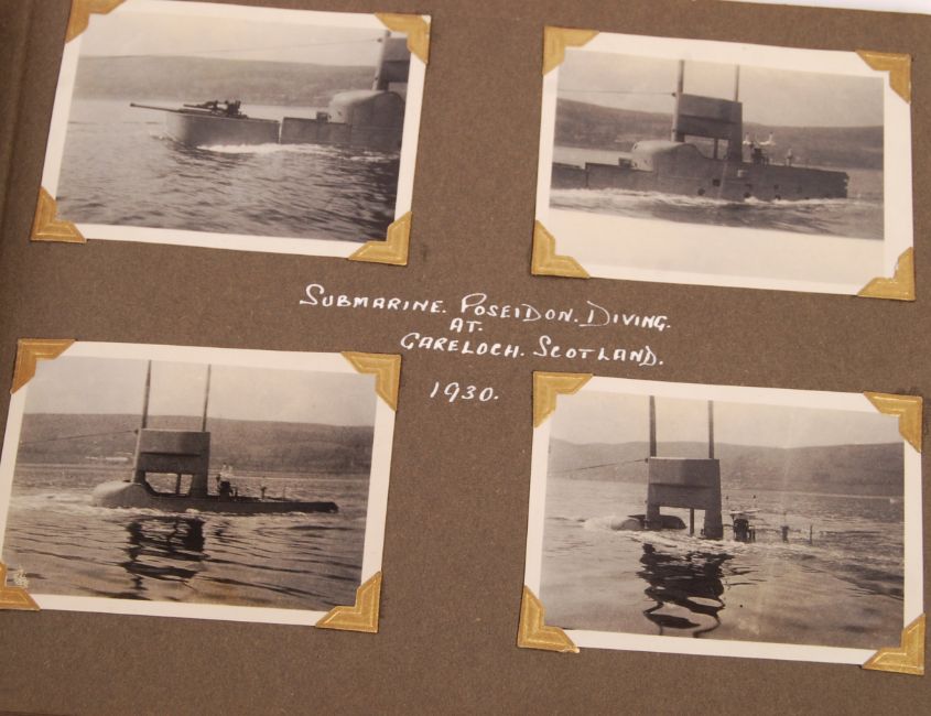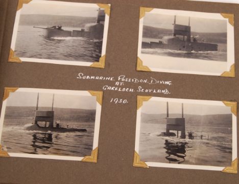 A fascinating pair of pre-WWII Second World War photograph albums from a Gentleman in the Royal Navy in the 1920's - 1930's stationed in Hong Kong and surrounding areas. Several photographs related to the sinking of Submarine Poseidon in 1931 - the photographer at one stage clearly being stationed on board before it's sinking. The first album (red stripes) starting in 1924 and shows views of: HMS Cyclops & Submarines, L26, Malta, HM Submarine Poseidon, L21 Engine Room, ' Boat bringing back survivors from Poseidon sunk in collision at Wei Hai Wei June 9th 1931 ', Torpedo drills, Hong Kong Harbour, various views of a damaged ship in dry dock, Empress Of Britain during her first World Cruise, various photos of Submarine Poseidon including several onboard views, Customs House Hong Kong,  Yugoslavia, Poseidon diving at Gareloch Scotland, Japan, Submarine Oswald, views onboard Medway, football match and many others.The second album (blue) featuring photographs of: Submarine crests, various funerals in Hong Kong, general life in WeiHaiWei, Fishing fleets in Hong Kong, Great Wall of China, Japanese 'Flappers', HMS Medway and submarines in Hong Kong, views on board HMS Medway, French settlement in Shanghai, Shanghai Racecourse, Nagasaki Japan 1933, Chinese Wedding, SM Phoenix diving trials 1936, SM Perseus, SM Rainbow, and many others. A fascinating collection of photographs - nearly all of which are annotated. Rare.