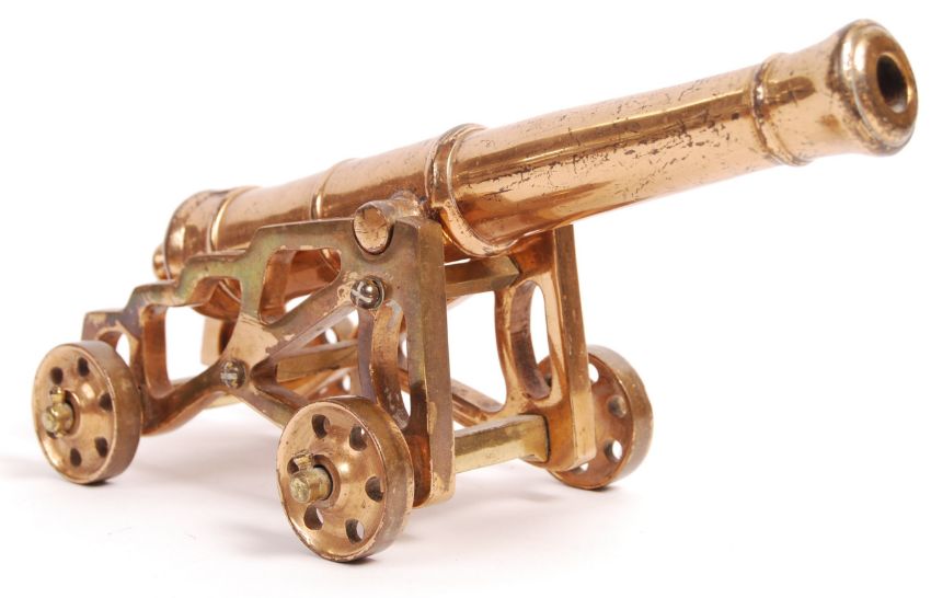 An early 20th century cast brass desk top paperweight model of a long range cannon. Raised on open base with working wheels. Measures: 24cm long.
