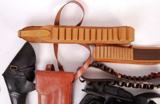 A collection of assorted 20th century replica / re-enactment / firearm related leather belts and pouches. To include; a quality riot belt with various attachments, magazine pouches, bandoliers, holsters etc. Good interesting collection.