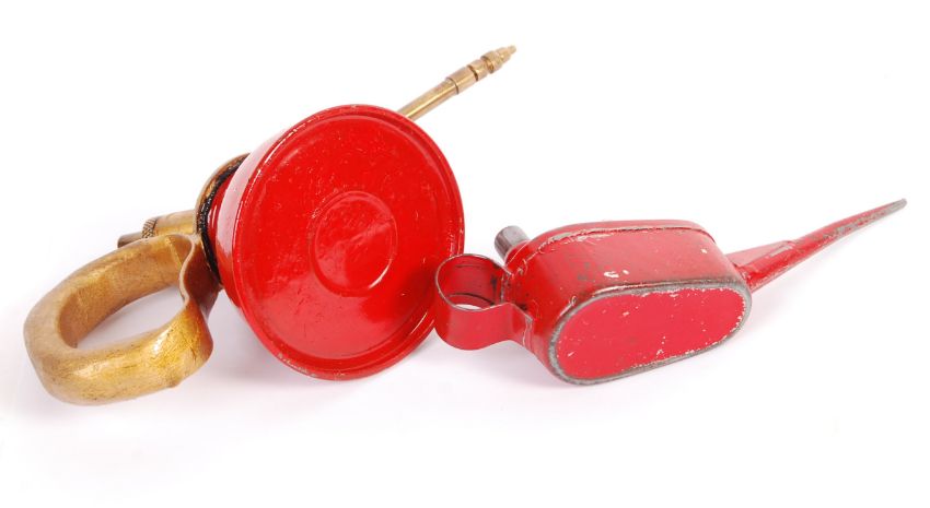 Two vintage early 20th century miniature classic car automobilia motoring oil cans comprising of a Sutcliffe Midget red oil can and a rare Parker-Late Valvespout leak proof durable oil can painted red with gilding. Largest measures: 22cm long.