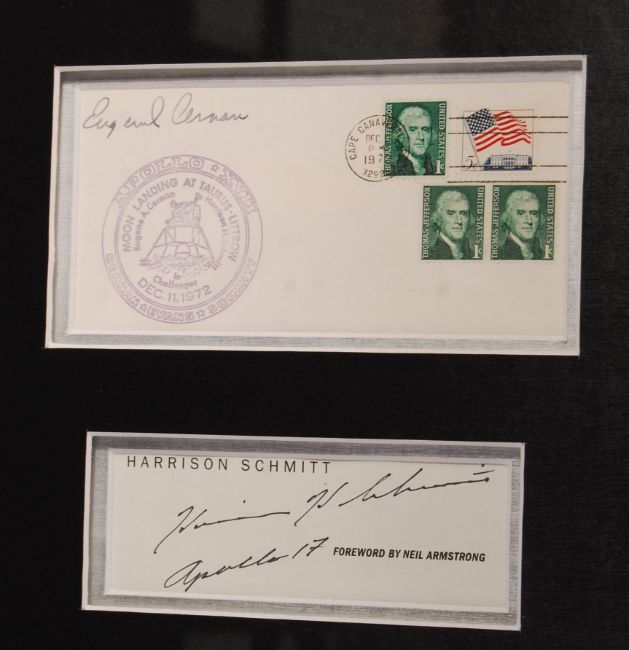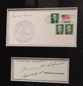 A stunning and unique Apollo Moonwalkers autograph presentation. The matted display featuring signed pieces from all twelve Apollo Moon Walker astronauts, including; Neil Armstrong (1930-2012), Buzz Aldrin, Pete Conrad (1930-1999), Alan Bean (1932-2018), Alan Shepard (1923-1998), Edgar Mitchell (1930-2016), David Scott, John Young (1930-2018), James Irwin (1930-1991), Charles Duke, Eugene Ceman (1934-2017), and Harrison Schmitt. The autographs either being on paper, covers or cards, come framed with a large central photograph and various replica NASA / Apollo mission patches. Professionally framed and glazed to a total size of: 83cm x 114cm. Certificated by Charles Phillips & Sons. A rare and impressive collection of autographs, made more poignant by the 50th anniversary this year of the Apollo 11 Moon Landings.