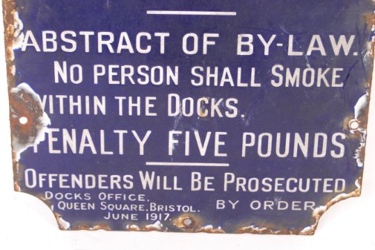 A rare early 20th century WWI First World War era enamel wall sign from the ' Port Of Bristol Authority ', being a ' No Smoking ' notice. Blue ground, with white text. ' Abstract of by-law - No Person Shall Smoke Within The Docks - Penalty Five Pounds '. Dated June 1917. Rare shaped sign, with dipped corners. Some edge chipping, as per images. A rare local interest period sign.