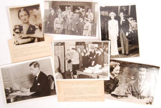 A rare collection of original 1930's German press photographs depicting the unofficial visit of Edward VIII to Germany in 1937. The collection of six 5x7" black and white gelatin print photographs depicting various 'official' photographs of Edward and Wallis Simpson both prior and during their 1937 visit to Nazi Germany. Of particular interest are two images taken during the visit - one in particular appears to be an 'unseen' photograph which depicts ' The Duke Of Windsor Visits The Office Of Public Welfare ' shows Edward VIII talking to a Nazi officer whilst various officials follow behind. The other photograph from the visit depicts Edward VIII outside a mine in the lower Rhine area performing a ' Nazi Salute ' with various officials. Other photographs all depict single shots of Edward and Wallis Simpson from official photographs, likely used to publicise their visit. All photographs carry official German press stamps to verso, some having printed captions stuck beneath. Some other non-related German press photographs are included (see photos). A rare and interesting collection.