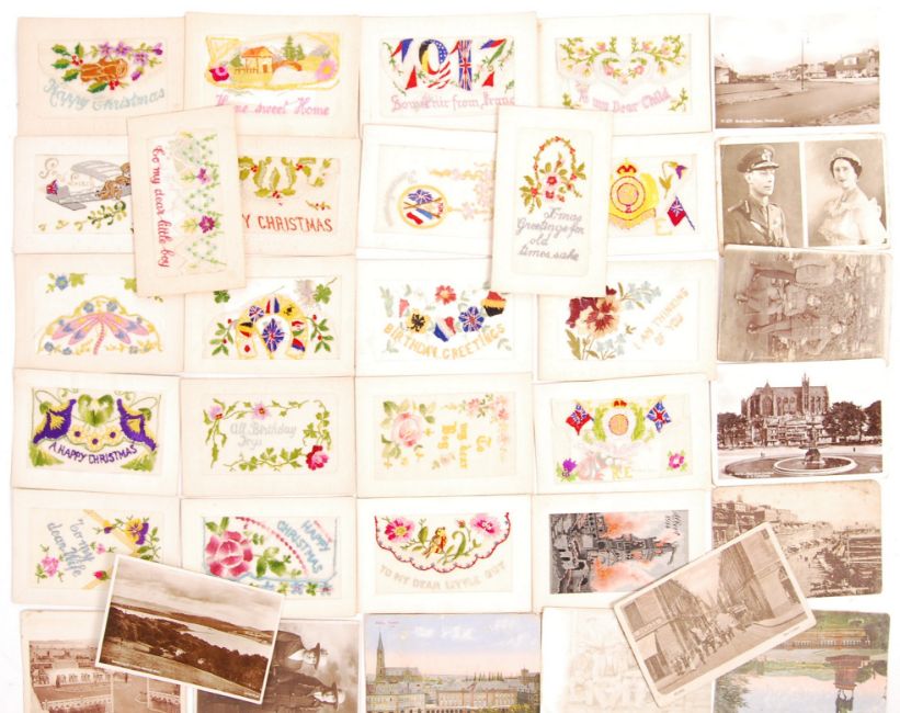 A charming collection of original WWI First World War era silk postcards - largely appearing to be from the same gentleman ' Arthur ' ' From France '. Some dated during wartime. Rather charming examples, including an RFC example. Some associated postcards also included. Great collection.