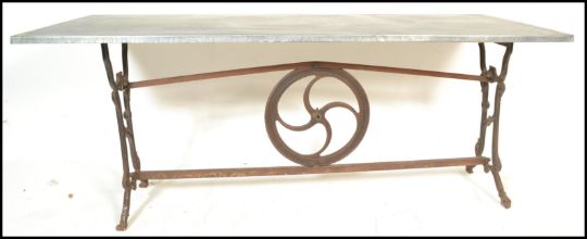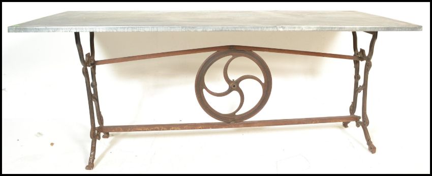 A vintage 20th Century upcycled industrial style dining / garden table having cast iron end supports originally from a sewing machine united with iron stretchers with an industrial wheel to the centre topped with a rectangular zinc table top above.  Measures 77 cm high x 195 cm wide x 84 cm deep.