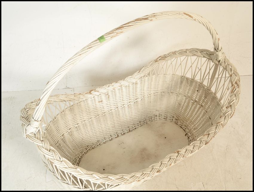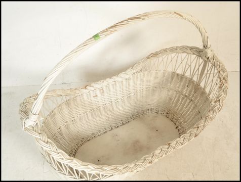 A vintage 20th Century wicker moses / laundry basket being painted in white, of large proportions with arched handle to the top.