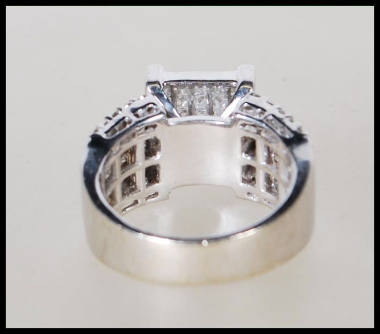 A stamped 14ct white gold and diamond ring. The head having a pave set of diamonds on a suspended mount with decorative diamond accent stones to the shoulders. Approx 2ct's of diamonds. Ring size N. Gross weight 9.4g.
