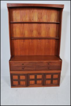 A retro 20th Century Teak wood highboard bookcase cabinet dresser by Nathan with a series of open shelves to the top over a configuration of drawers and cupboards, separates into two. Dimensions are 199cms x 125cms x 46cms.