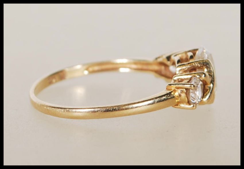 A stamped 585 14ct gold ring set with a central oval cut white stone flanked by two round cut white stones within a cross over design. Weight 1.9g. Size N.