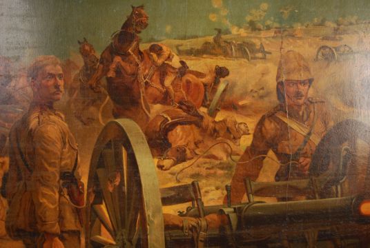 After Richard Caton Woodville Jr (1856-1927) - A framed early 20th century Boer War interest military painting print depicting soldiers under fire with cannons and cavalry. Printed signature to lower left corner and dated 1900. Set to a gilt painted wooden frame. Frame measures: 94cm x 69cm.