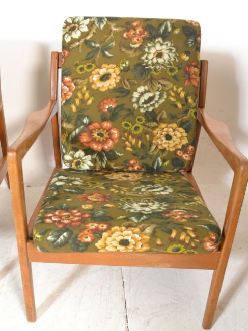 A 1970's - mid century original teak Danish influence sofa in the manner of Scandart. The show wood teak frame with stunning angular arms together with a pair of matching armchairs. Dimensions are 70cms x 160cms x 92cms