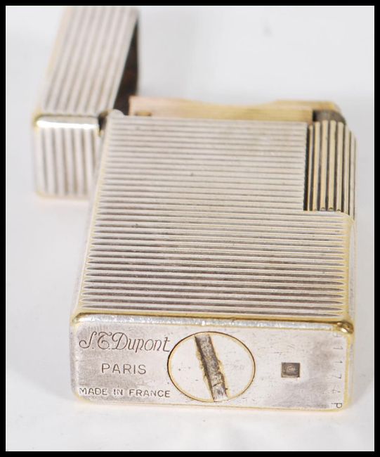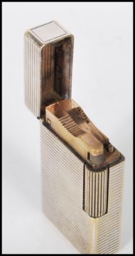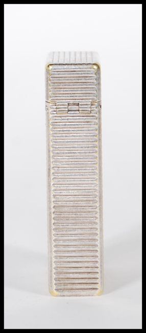 A vintage 20th Century Dupont of Paris white metal pocket lighter having striped decorated body. Stamps to base. Measures 6cm tall by 3.5cm wide.