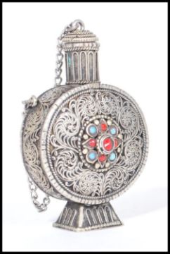 A late 19th / early 20th Century Chinese silver opium snuff / scent perfume bottle of moon flask shape having filigree scroll decoration with turquoise and red stone detailing to centre. Raised on pedestal foot with rope twist lid with scoop / spoon. Complete with safety chain. Measures: 5cm tall