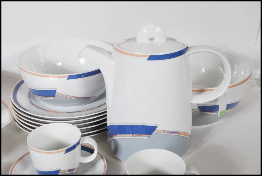 A Art Deco inspired dinner and coffee service by Thomas Germany consisting of coffee pot, saucers, cups, creamer and lidded sugar bowl, dinner and side plates, serving plates, lidded treen, serving bowls, gravy boat and bowls. All having marks to bases. Coffee pot measures 19 cm tall by 22cm wide.
