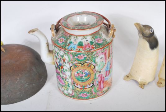 A Chinese famille verte teapot being hand painted with floral and narrative panels bound handles to the top (unmarked to base), a selection of penguins made from horn and a Japanese wind chime constructed from graduating domed chimes engraved with cranes.