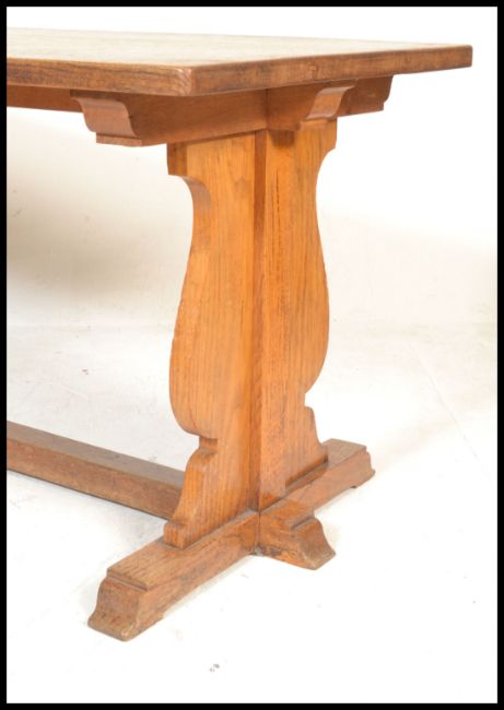 An early 20th century golden oak refectory dining table. Raised on twin square column end supports united by stretchers having large flared top above, originally from Westbury On Trym library. Measures: 77 cms tall x 183 cms wide x 76 cms deep