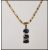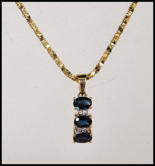 A stamped 375 9ct gold necklace having a pendant set with three oval cut sapphires with white accent stone spacers. Pendant bale and clasp stamped 375. Chain measures 46cm.