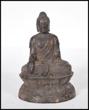 A 19th Century cast bronze figurine of a mandalay style Buddha depicted seated in the lotus position raised on a lotus flower design base. Measures 11cm tall.