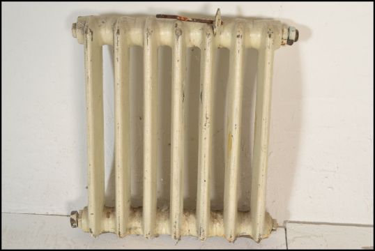 An early 20th Century two bar seven column cast iron radiator having a white paint finish. Measures 60cm tall by 52cm wide.