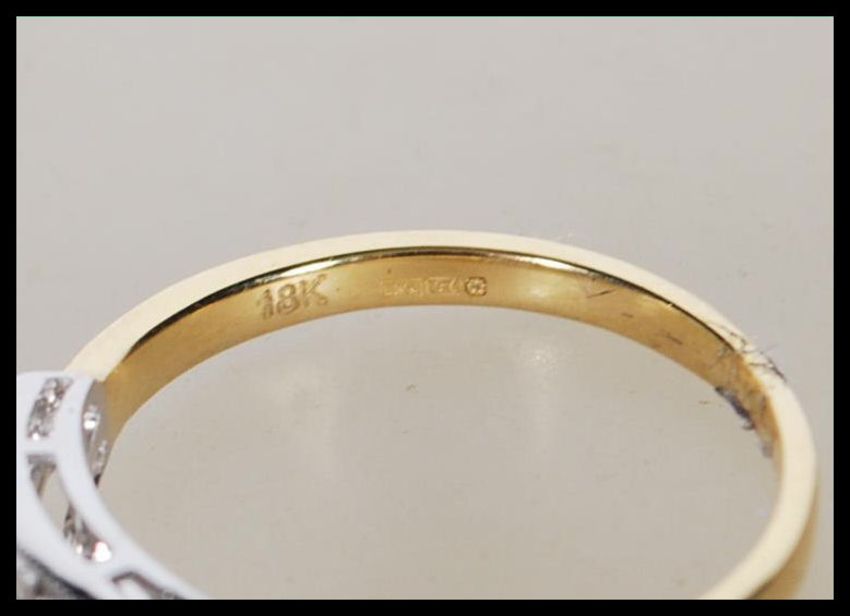 A stamped 750 18ct yellow gold ladies dress ring in the Art Deco style set with five graduating diamond stones. Approx 40 pts. Ring size N. Gross weight 2.2g.