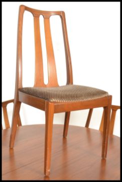 A retro 20th Century teak wood extendable dining table and matching chairs by Nathan, the circular table raised on tapering shaped supports together with a set of four teak wood splat back dining chairs by Nathan. Dimensions are 76 cms high x 126 cms in diameter.