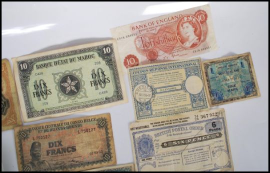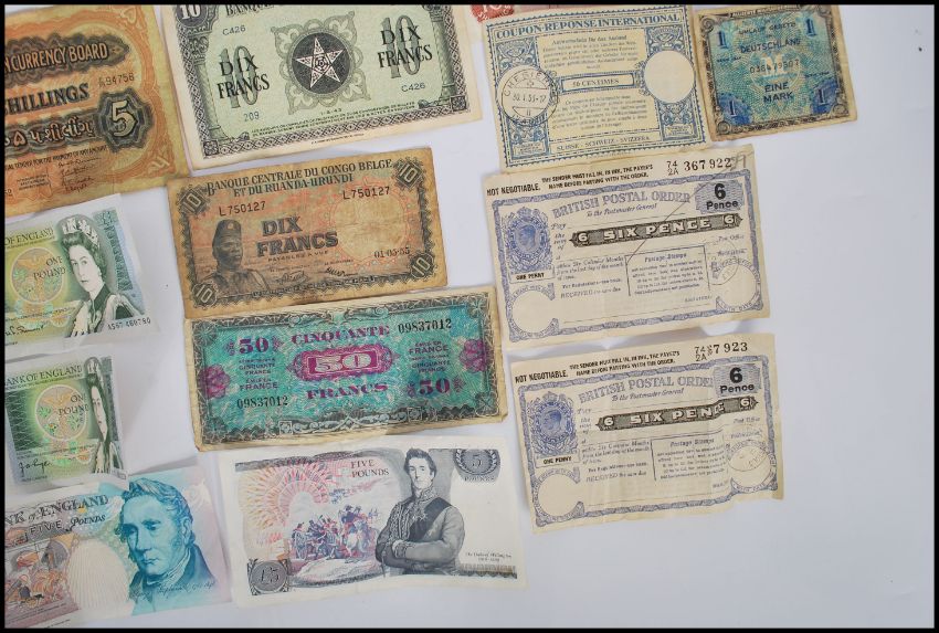 A collection of bank notes, most being 20th Century British to include a Five Shillings Note from the East African Currency Board Nairobi 1952, a selection of Queen Elizabeth one pound notes, a Duke of Wellington five pound note, two six pence British Postal Orders, along with some foreign notes including a Deutschland Eine mark note, a French colonial notes, etc.