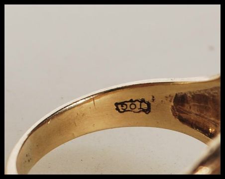 An English hallmarked 9ct gold lion mask ring having pierced eyes and mouth. Assay marks for London. Weight 7.4g. Size R.
