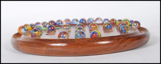 A 20th Century solitaire board game having a full set of coloured swirl glass marbles on a circular oak base.