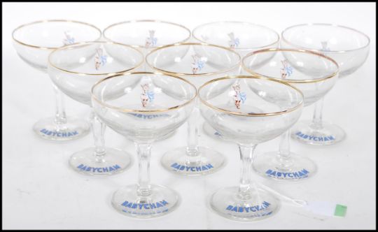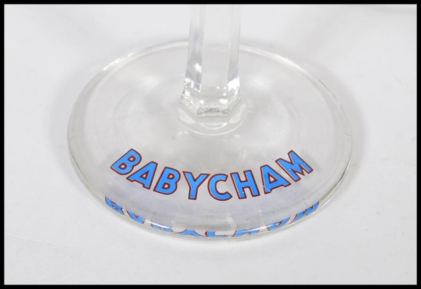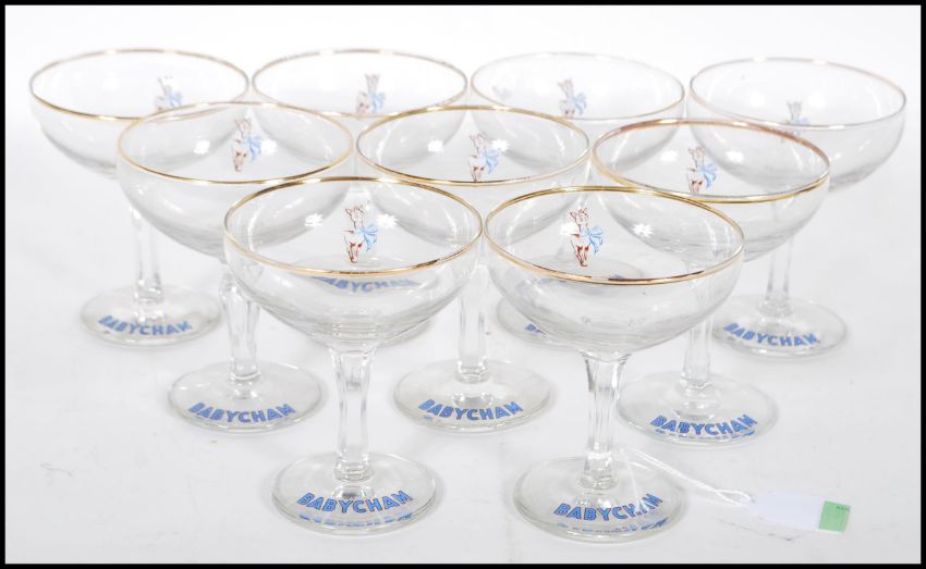 Babycham - A set of nine original vintage retro advertising point of sale drinks pub bar display Babycham glasses. Each glass having a shaped bowl with the iconic Babycham fawn deer in white with gilded border raised on shaped faceted hexagonal stem over circular foot base with blue lettering. Measures: 11cm tall.
