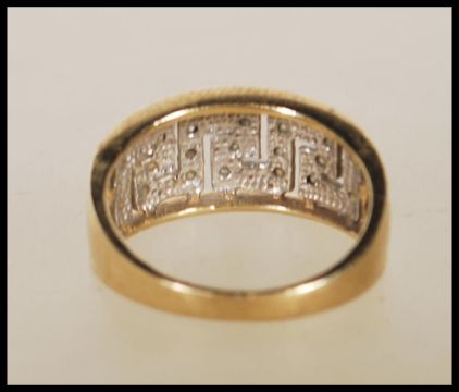 A hallmarked 9ct yellow gold ring having illusion pierced greek key decoration set with diamond accent stones. Hallmarks for Sheffield 375 stamped GA. Weighs 2.8g. Ring size M.