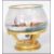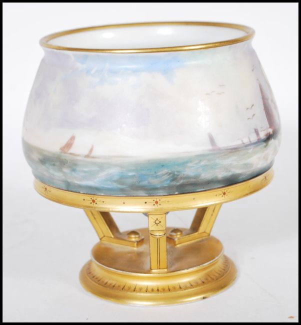 A 20th Century ceramic vase having a bulbous body with hand painted maritime decoration of ships sailing, raised on a ceramic gilt tripod base terminating in a round plinth with hand painted patterning. The base being unmarked but etched 'm'. Measures: 13 cms tall x 14 cms diameter.
