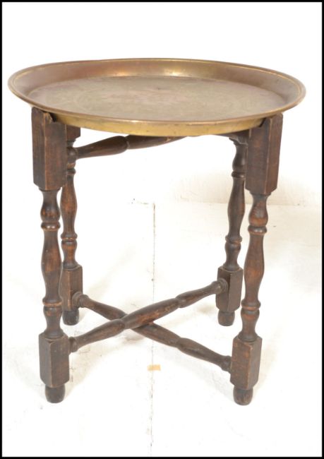 A 19th Century copper milk churn together with two Persian style hand worked coffee pots and a Beaneries table.