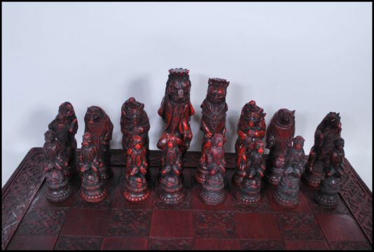 A large contemporary chess set heraldic style chess set and board in  resin with. The chess pieces in the form of various beasts and mythical creatures.