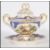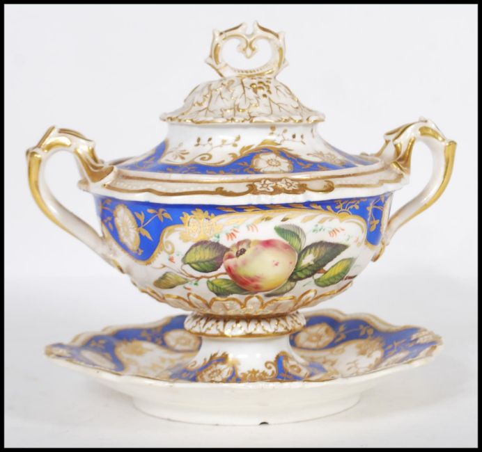 A 19th Century English Regency lidded ceramic twin handled tureen having detailed floral gilt work above sectional cobalt blue colouration with panels of hand painted fruits, the lid having a scrolled handle to the top surrounded by vine leaf decoration.