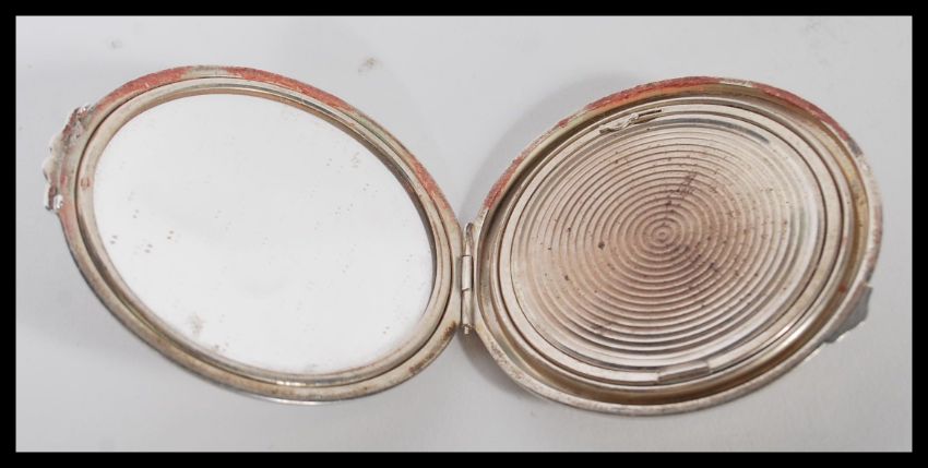 A silver hallmarked roundel shaped ladies powder compact with inset mirror to the lid, powder compartment with door inside. Engine turned with central monogram. Measures 7cms diameter