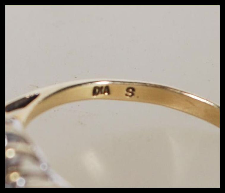 A hallmarked 9ct gold diamond cluster ring having four larger stones to the centre surrounded by white accent stones. Assay marked for Sheffield and stamped 0.25 ct diamonds. Weight 2.4g. Size S.
