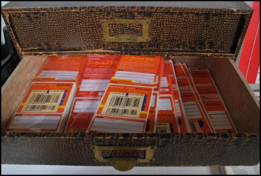 POST OFFICE counter obsolete stationery. Large quantity now collectable memorabilia housed in original GPO draw unit. Range of official stickers, forms, airmail, adverts, leaflets/printed info, mail sack, posting templates/size guides (inc scarcer perspex variety).