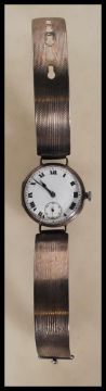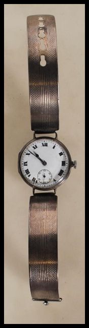 A 1920's/ 30's gentleman's wrist watch having a round face with a white enamelled face with roman numerals to the chapter ring and subsidiary dial, on a stamped sterling silver bracelet with engine turned decoration. Gross weight 37.1g.