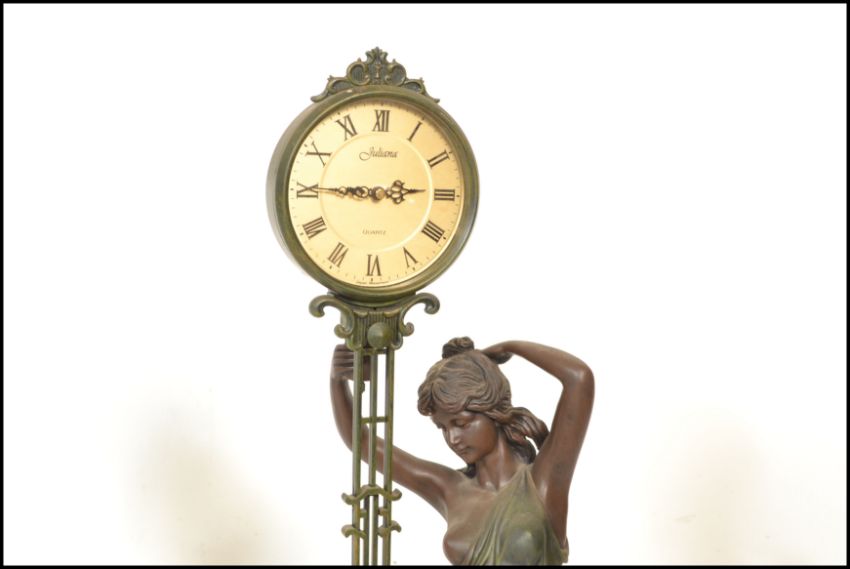 A contemporary Juliana figural pendulum quartz clock, the movement held aloft by a classical style semi clad female figure, with a nake child holding her dress.  Measures 90cm high